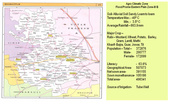 According to Agroclimatic zone, Bharatpur district comes under Flood prone Eastern Plain Zone IIIb of Rajasthan. The climate of this district is dry, which become extremely hot during summer and extremely cold during winter. The period of monsoon is very short. In last ten years rain fall is very less dry spell are more and uneven distribution of rainfall.